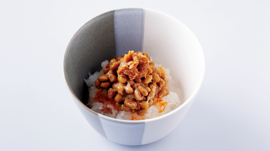 大根(すりおろす)100gはざるに上げて軽く水けをきる。器に盛ってラー油小さじ1/2をふり、納豆(小)1パック(30g)をのせる。みそ小さじ1を添え、混ぜて食べる。