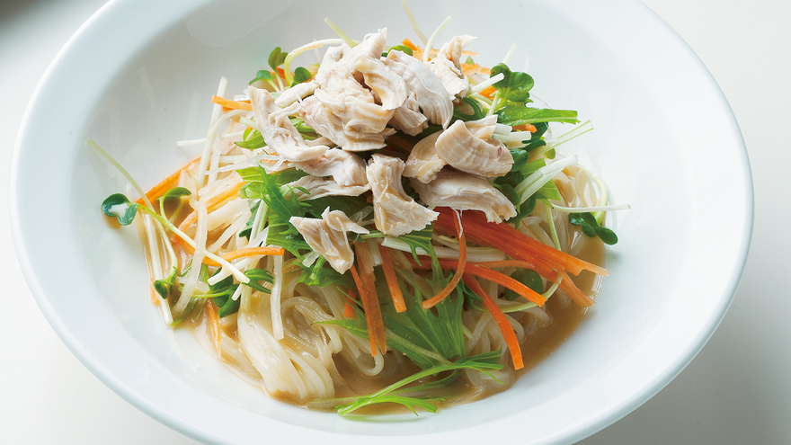 シャキシャキの野菜とコクのあるごまだれが絶妙のコンビネーションです。麺に下味をつけて、たれとのなじみをよくしましょう。