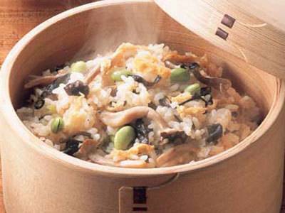 32を加えて全体をよく混ぜ、炊飯器のスイッチを入れて炊く。炊き上がったら、枝豆を加えて混ぜる。