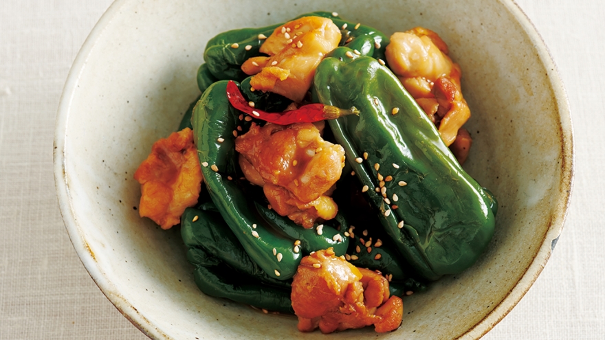 ピーマンを種やヘタがついたまま入れ、赤とうがらしを加えて1~2分間炒め、酒大さじ2、水大さじ3を加える。煮立ったら【A】を順に加えて混ぜる。ふたをし、弱火で約8分間煮る。器に盛り、白ごまをふる。