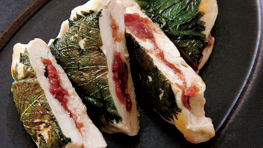 ささ身の表面の半分に1の梅肉を塗る。半分に折り、両面に青じそを1枚ずつ貼りつける。