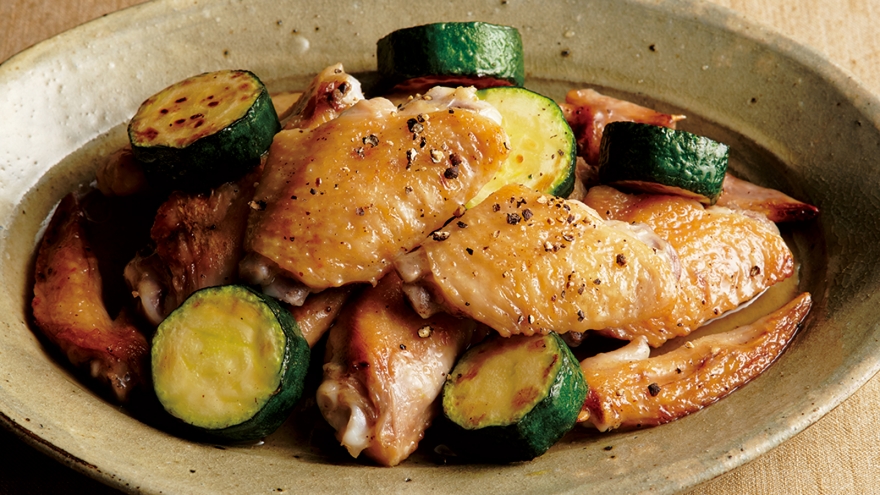 フライパンにサラダ油大さじ2を中火で熱し、手羽先を皮の厚いほうを下にして並べ入れ、ズッキーニを加えて4~5分間焼く。途中、ズッキーニを返し、両面に焼き色がついたら取り出し、塩少々をふる。手羽先を返して3~4分間焼き、酒大さじ2をふってふたをし、弱火で約5分間蒸し焼きにする。