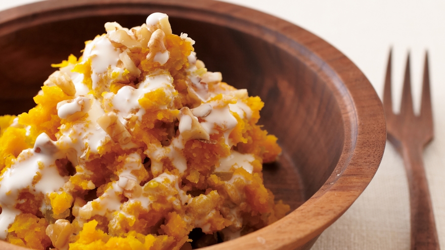 ラップを向こう側から外し、ペーパータオルで押さえてかぼちゃの水分を吸い取るように取り除く。包丁で皮をむき、熱いうちにフォークやマッシャーで粗くつぶし、くるみを加えて混ぜる。器に盛り、【A】をかける。