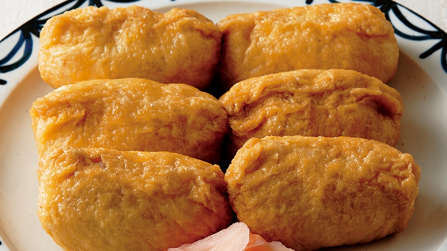 甘辛く煮含めた油揚げに、すし飯を詰めるおなじみのおいなりさんです。すし飯に、柚子(ゆず)の皮とごまを混ぜて風味アップ。