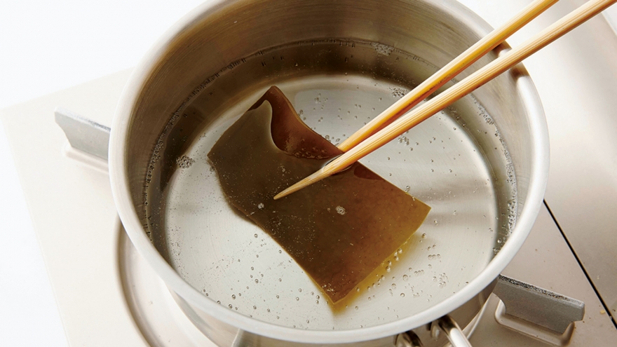鍋に昆布、分量の水を入れ、1~2時間おく。弱火にかけ、煮立つ直前に昆布を取り出す。