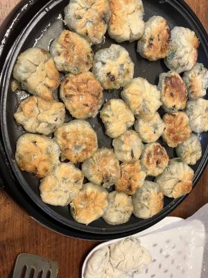 フライパンに薄くサラダ油をぬり、5をとじ目を下にして並べ、皮の表面にも油をぬる。まんじゅうの高さの半分くらいまで熱湯を注ぎ、ふたをして中火で7~8分間蒸し焼きにする。水けがなくなったらふたをはずし、焼き色がついたらひっくり返してサラダ油適量を足し、反対側にも焼き色をつける。酢じょうゆをつけて食べる。