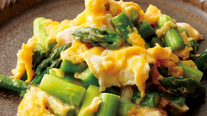 アスパラガスの甘みと卵のやさしいうまみとの相性抜群。彩りも鮮やかで春らしい一品。朝食にもおすすめです。
