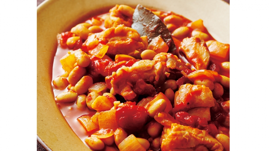 フライパンに油を中火で熱し、鶏肉を皮を下にして並べ入れ、両面を軽く焼く。たまねぎ、にんにくを加えて炒め、たまねぎが透き通ってきたら、大豆、トマトの水煮、【A】を加える。煮立ったら弱めの中火にし、ふたをして15~20分間煮る。塩・こしょうで味を調える。