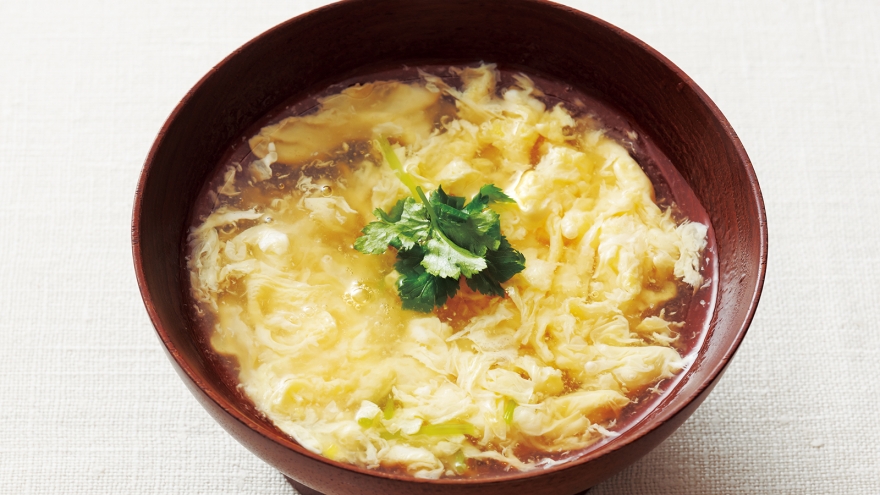 かきたま汁の卵をフワフワにする秘けつは″とろみ″。水溶き片栗粉で汁にとろみをつけておくと、卵が薄い膜状に広がってフワフワに。片栗粉を倍量の水で溶き、少しずつ加えるとよい。