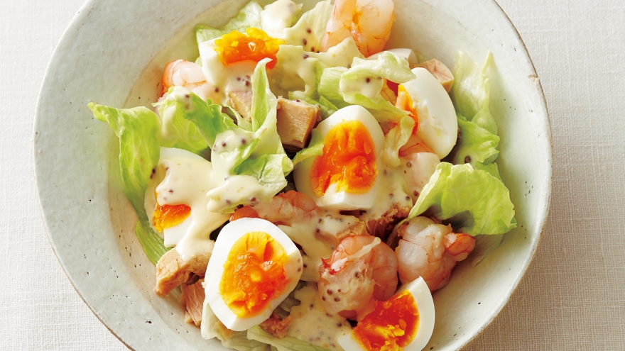 柔らかめにゆでた卵が華やかなおかずサラダです。卵にも魚介にもよく合う粒マスタード入りのまろやかソースで。