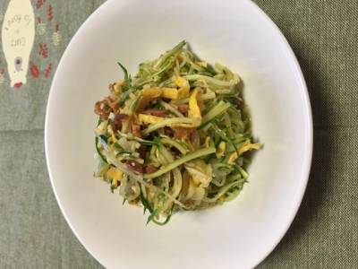 【A】を溶きほぐし、塩1つまみを加えて混ぜる。フライパンにサラダ油小さじ1を薄く塗って中火で熱し、卵液を薄く流す。表面が乾いたら返し、取り出して冷ます。4~5cm長さ、4~5mm幅に切る。