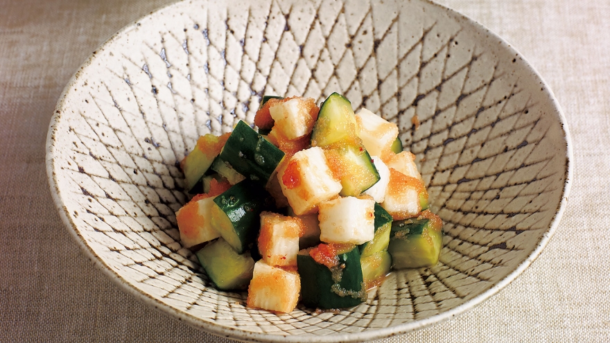 明太子の辛みや塩けを生かした簡単なあえ物。コロコロに切ったきゅうりと長芋にあえ衣がよくなじみます。独特の食感が楽しい一品。