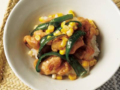 【照り焼きだれ】の材料を混ぜ合わせて2に回し入れ、中火で煮詰めながら味をからめる。器に盛ったご飯にのせ、フライパンに残ったたれをかけ、1のとうもろこしを散らす。