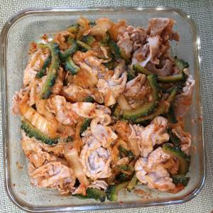 ゴーヤーは軽くゆでて歯ごたえを残しましょう。豚肉のうまみとキムチの辛みをプラスしてボリュームあるあえ物に。ご飯にもビールにもよく合います。