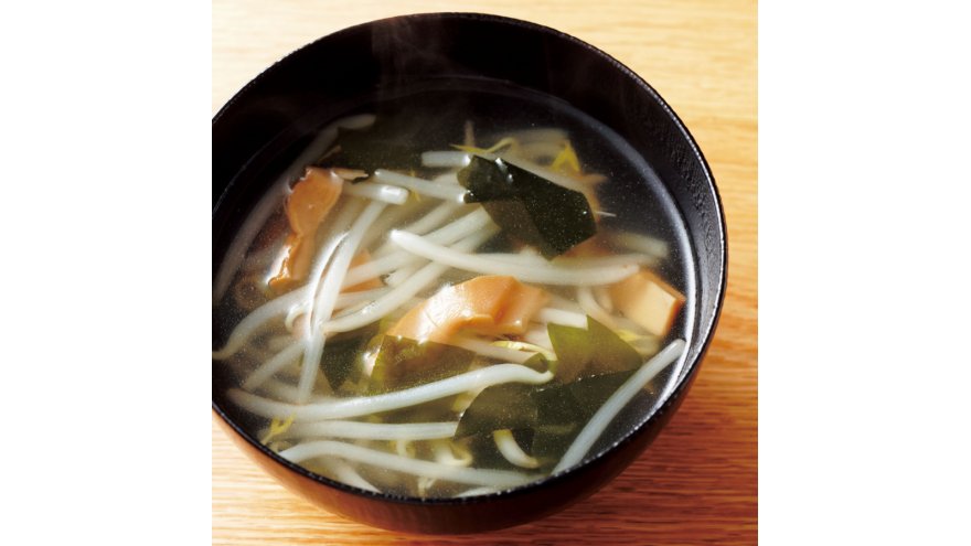 鍋に水カップ2、スープの素を入れて中火にかけ、煮立ったら、もやしとわかめを加えて約2分間煮る。メンマ、塩小さじ1/3、こしょう少々を加えて混ぜる。