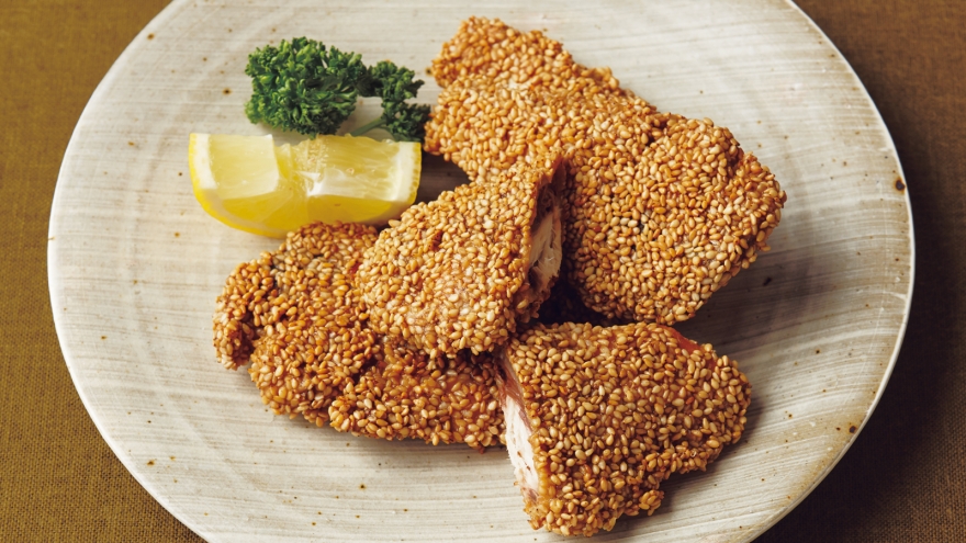 たっぷりまぶしたごまは、香ばしさとカリッとした食感が魅力です。下味の練がらしの風味が、さばのうまみを引き立てます。