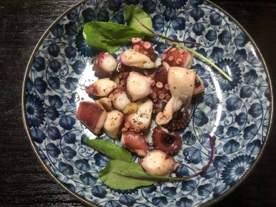 フライパンにオリーブ油、にんにくを入れて弱火で熱する。にんにくがカリッとして、きつね色になったら強火にし、たこを加えて炒め合わせる。全体に油が回ったら、【調味料】の材料を加えて混ぜる。