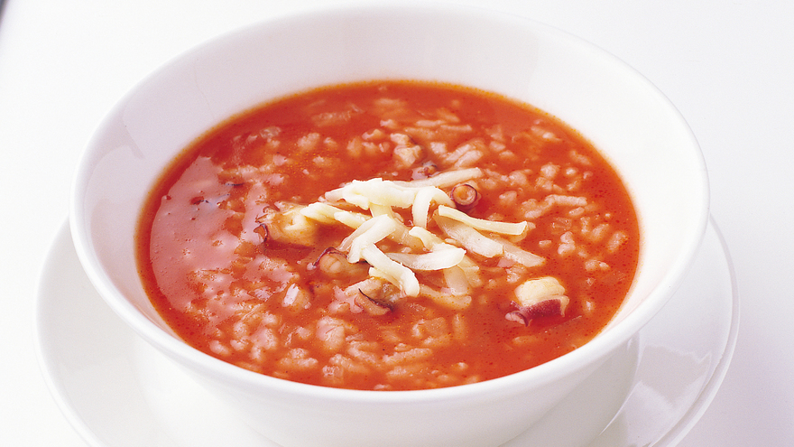 鍋にサラダ油大さじ1を中火で熱し、たこ、たまねぎを入れてサッと炒める。全体に油が回ったら、水カップ1+1/2、固形スープの素1コ、トマトジュース(食塩不使用)カップ1、塩小さじ1/5、こしょう少々を加えて混ぜる。