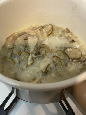 鍋にバター約大さじ1/2を中火で熱し、たまねぎをいためる。透き通ってきたらバター約大さじ1ときのこ類を加えていため、水分が出てきたらごぼうも加えていためる。チキンスープを加え、塩少々を加えて、煮立ったらアクを取り、火を弱めて15分間煮る。