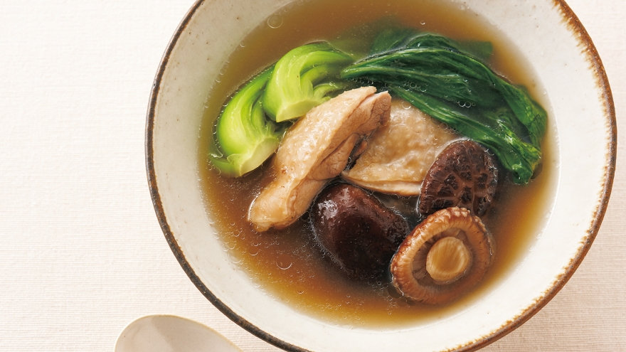干ししいたけは、戻し汁も使ってうまみを最大限に。骨付き肉との相乗効果でうまみが倍増します。味わい深いスープが完成です。
