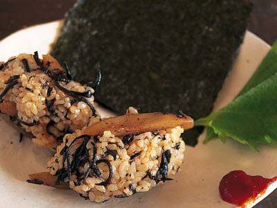 小さめのおにぎりを4コつくり、1枚を4等分にしたのり、2枚を半分に切った青じそ、コチュジャン適量を添える。