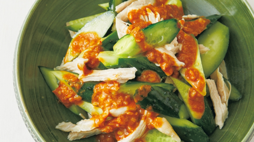 いつもは脇役のきゅうりをたっぷり使っておかずサラダにします。むね肉はレンジで蒸すので簡単です。塩もみすることで、おいしさがグンとアップします。