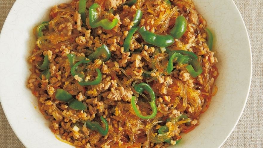 春雨に豚ひき肉のうまみをしみ込ませて味わいます。春雨に合わせてピーマンは細切りにし、食感と彩りに変化をつけて。