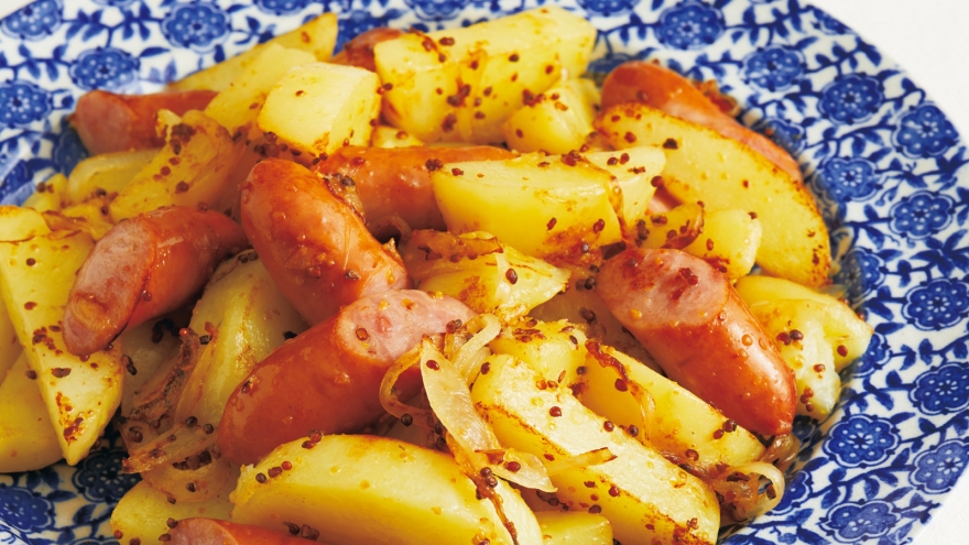 電子レンジを活用してじゃがいもを炒める時間を短縮。たまねぎの甘みとソーセージの濃厚なうまみが粒マスタードとよく合います。