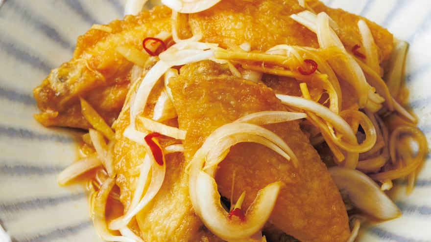2は熱いうちに、混ぜておいた【A】につける。たまねぎを加え、約5分間おいて味をなじませる。
