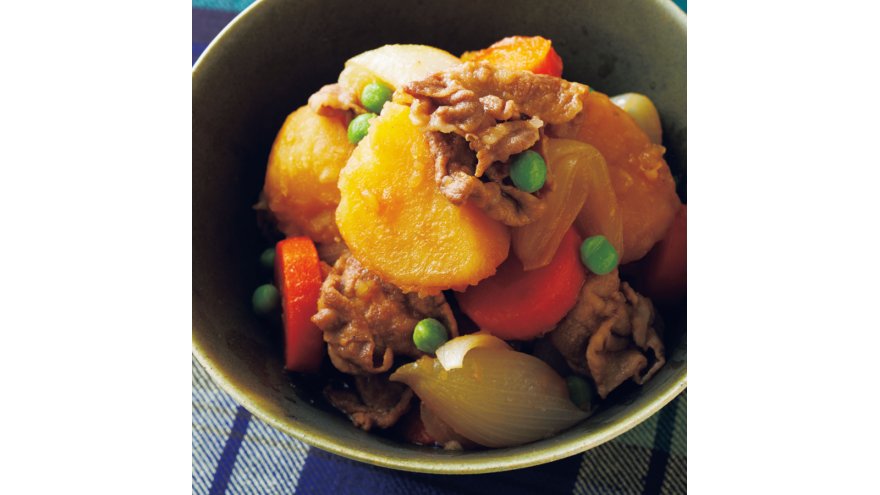 じゃがいもは1コを4等分に切り、水でサッと洗って水けをきる。にんじんは7mm厚さの輪切りにし、たまねぎは8等分のくし形に切る。豚肉は長ければ半分に切る。グリンピースは水に4~5分間つけて解凍する。