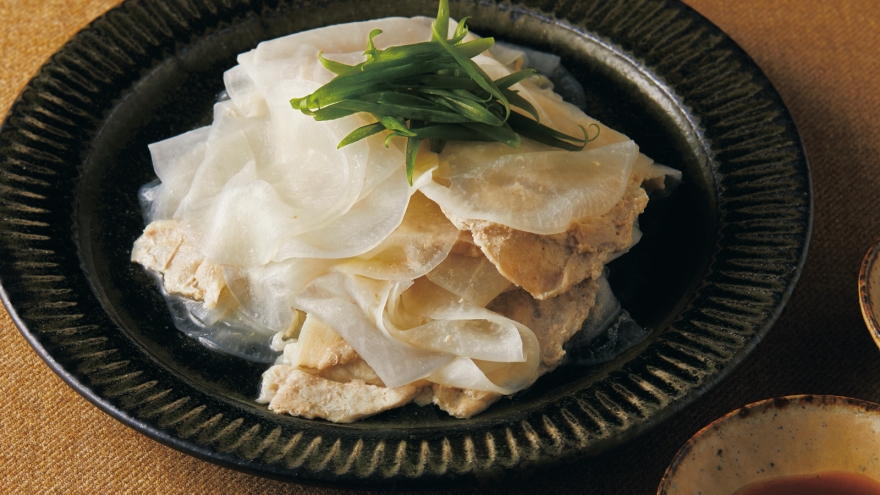 豚肉と大根を重ねて蒸すことで、煮物ともしゃぶしゃぶとも違った食感と、味のハーモニーが生まれます。大根はなるべく薄いほうがいいので、スライサーがおすすめです。