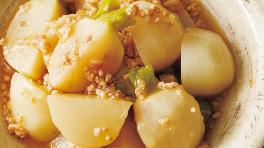 とろみをつけた煮汁がかぶにからみ、そぼろのうまみがなじみます。小さめのフライパンで煮ると煮くずれを防げます。
