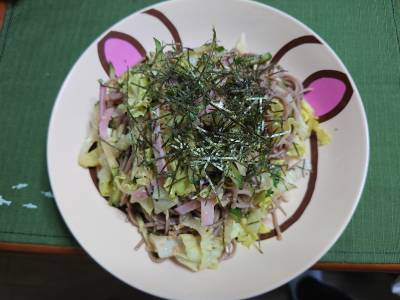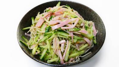 5のそばを3のボウルに加えてよくあえ、きゅうりとハムも加えてざっと混ぜる。