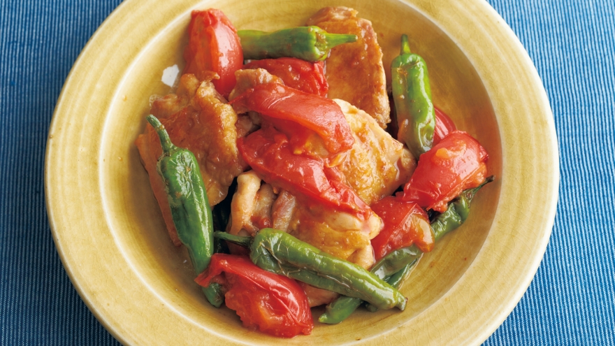 鶏肉とししとうを寄せ、あいたところにトマトを加え、軽く焼きつける。トマトが少しくずれてきたら、焼き肉のたれを加え、全体にからめる。