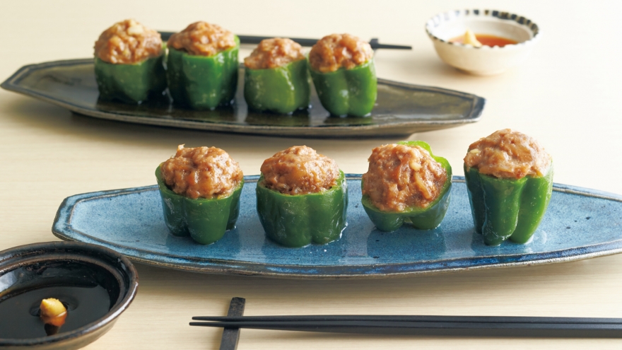 シューマイの肉ダネをピーマンに詰めてレンジにかけます。うまみが凝縮されて、しっとりとした食感に感激です。