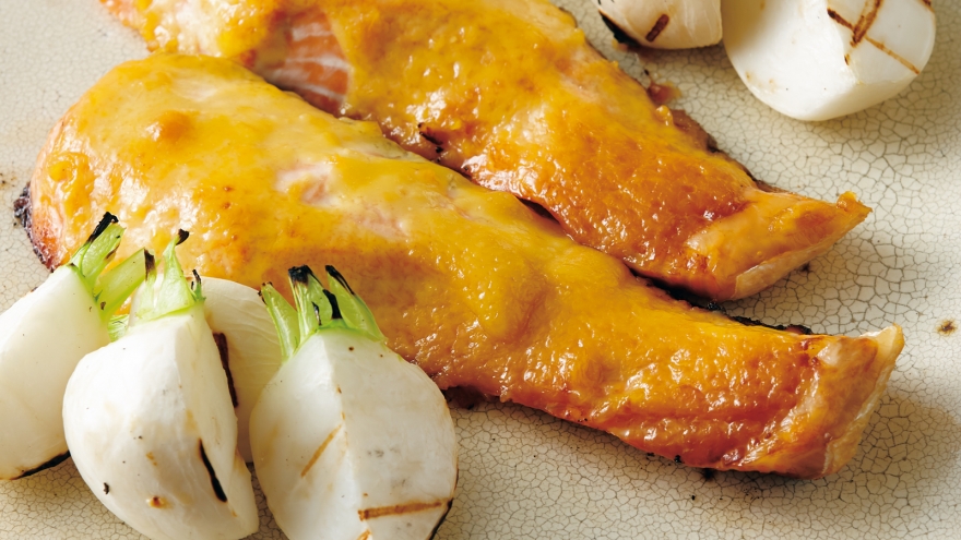 火を止め、【みそマヨ】をさけに塗る。再びグリルに入れ、中火で薄い焼き色がつくまで2~3分間焼く。かぶは焼き色がついたら取り出し、器に盛ったさけに添える。