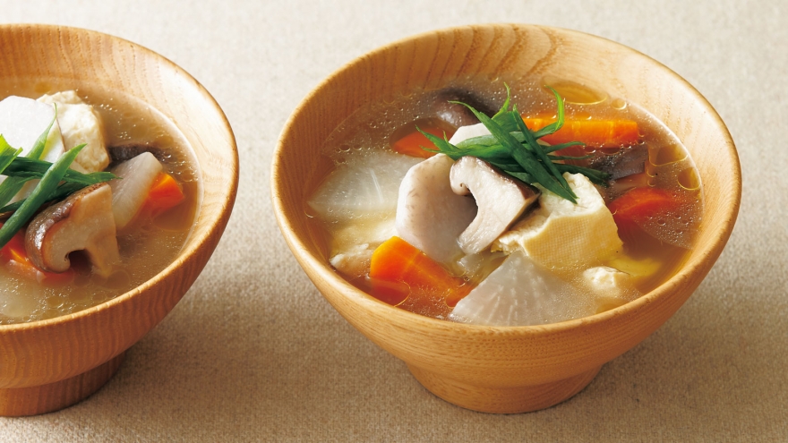根菜やきのこ、豆腐でつくる具だくさん汁物です。野菜は厚みや大きさをそろえて火の通りを均等に。豆腐は手でちぎって最後に加え、柔らかく仕上げましょう。