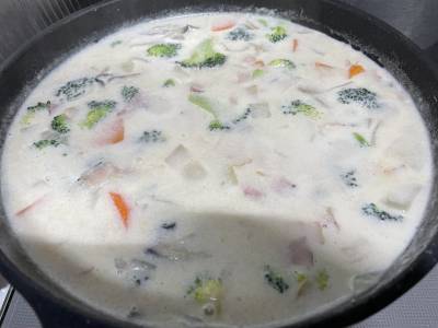 チャウダーは魚介と野菜を煮込んだアメリカの人気スープ。かきは煮すぎると縮むので、ぷっくりとしたら牛乳を加え、手早く仕上げましょう。