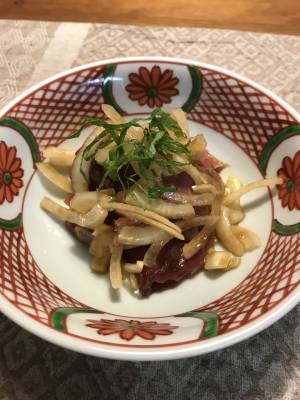 たまねぎを縦4等分に切ってから横に薄切りにすると長さが短くなり、かつおによくからんで食べやすい。