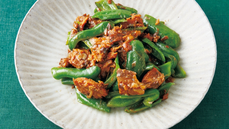 ピーマンがしんなりしてきたら中央をあけ、さばのみそ煮を加える。フォークなどで刺してさばだけを入れ、缶汁はとっておく。