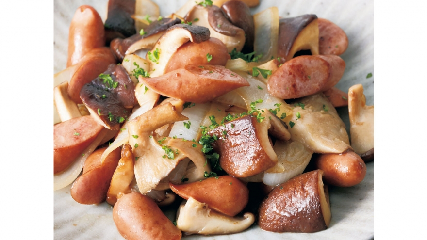 フライパンにバターを入れて中火で溶かし、ウインナー、たまねぎ、しいたけの順に加え、約4分間炒める。しょうゆ小さじ2、こしょう少々をふって混ぜる。器に盛り、パセリをふる。