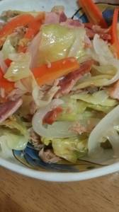 フライパンに油大さじ1を中火で熱し、チンゲンサイの軸(茎)、葉、パプリカの順に入れて約2分間炒め、塩少々をふる。火を止めて取り出す。