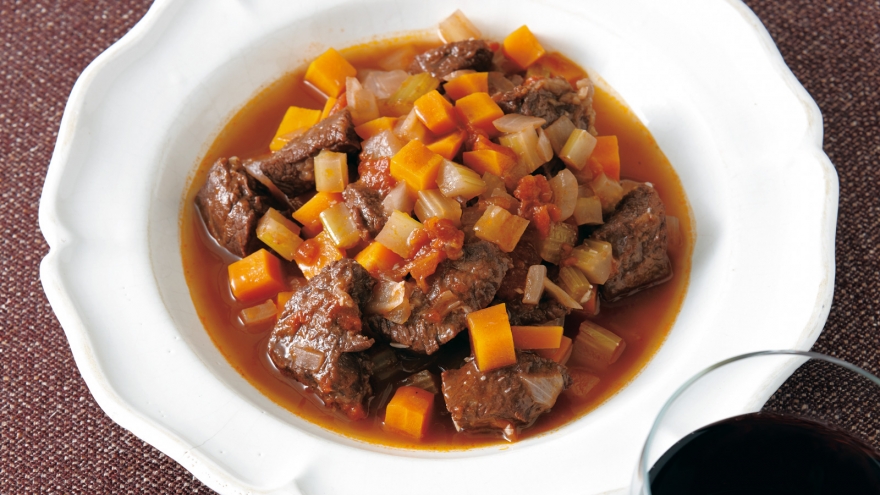 鍋に材料を全部入れてコトコト煮るだけ。牛肉と野菜のうまみ、赤ワインの風味が一つになって極上の一皿です。