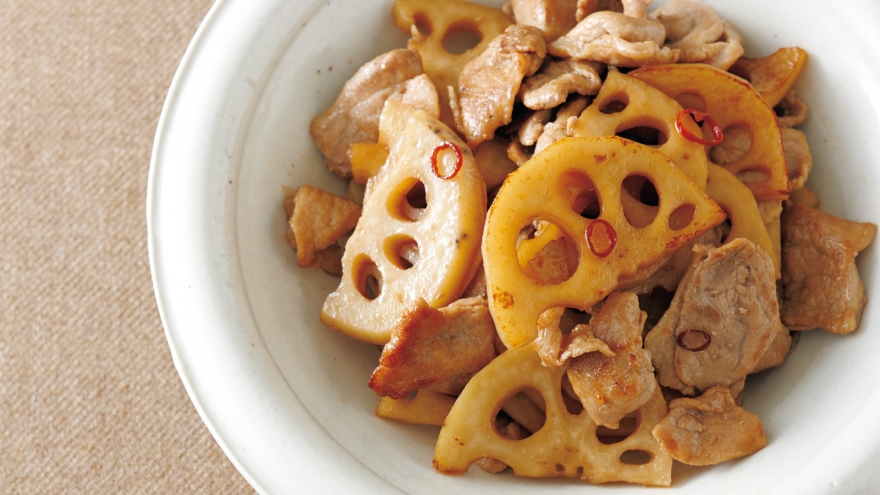 肉の色が変わったら、れんこんを加えて、よく炒める。れんこんが透き通ってきたら、赤とうがらしを加えてサッと炒める。