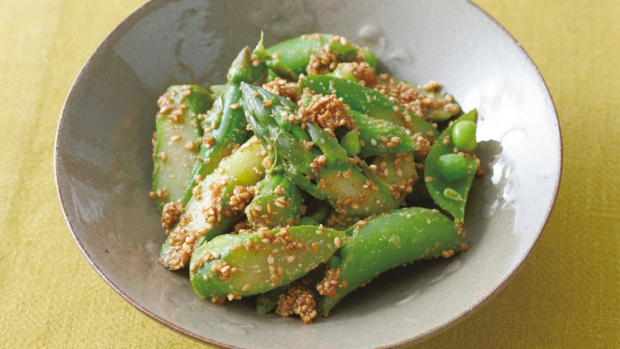 2 種の春野菜でつくるごまあえ。色よくゆでて、風味と歯ごたえの違いを楽しみましょう。鮮やかな緑色とごまの風味が食欲をそそります。
