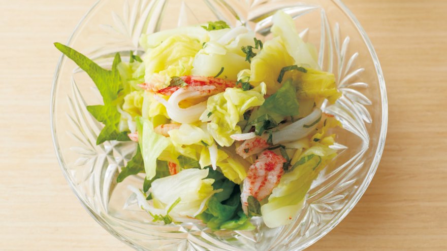 キャベツは塊のまま耐熱ボウルに入れ、ふんわりとラップをし、電子レンジ(600W)に約3分間かける。すぐにざるに上げて粗熱を取り、葉はザク切り、軸は薄切りにし、水けを絞る。