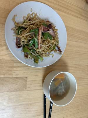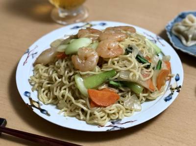 ほぼ火が通ったら、中華めん、チンゲンサイの葉、水カップ1/2を加えてさらに炒める。