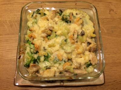 マカロニとブロッコリを加え、【ホワイトソース】を加えてあえて、火を止め、バター適量をぬったグラタン皿に入れる。粉チーズをふって220℃に熱したオーブンで10分間ほど焼く。