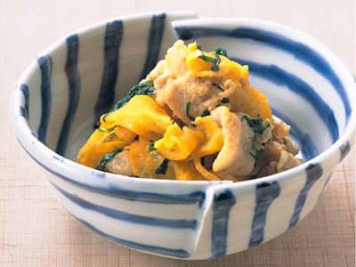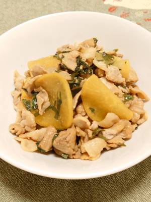 小鍋にごま油をよく熱し、肉を入れる。肉の色が変わるまでいためたら、たくあんを加える。たくあんの味をみながら、しょうゆを加える。青じそを加えて混ぜ、火を止める。