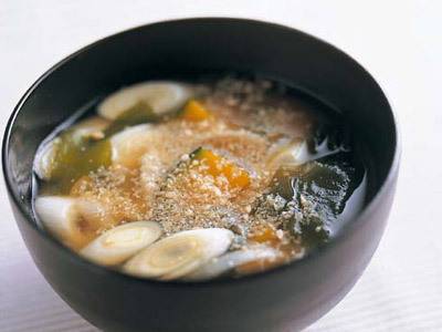 通常、汁物のだしは1人分150mlでみそが大さじ2/3。だしの量を減らさず、みそだけを控えたのでは味がぼやけるため、だしを120mlに減らし、みそを大さじ1/2弱にする。